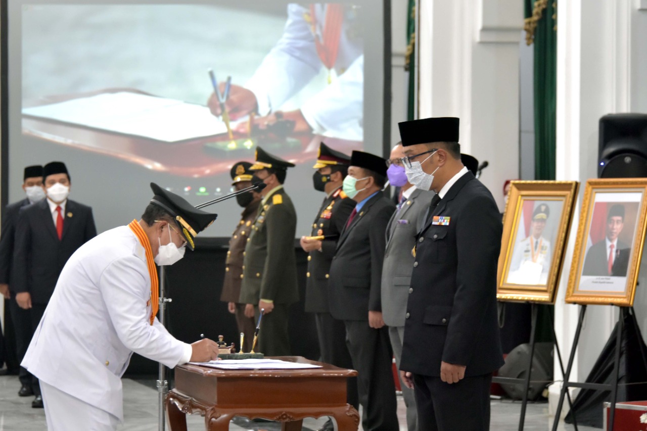 Gubernur Jawa Barat (Jabar) Ridwan Kamil melantik Herman Suherman dan TB Mulyana Syahrudin sebagai Bupati dan Wakil Bupati Cianjur hasil Pilkada Serentak 2020. Pelantikan berlangsung di Gedung Sate, Kota Bandung, Selasa (18/5/2021), dengan menerapkan protokol kesehatan.