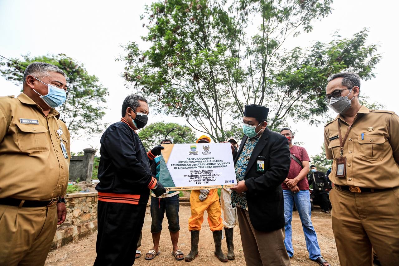 Pemerintah Kota (Pemkot) Bandung bersama Badan Amil Zakat Nasional (Baznas) Kota Bandung memberikan bantuan Alat Pelindung Diri (APD), vitamin dan sembako kepada petugas lapangan di TPU Cikadut.?