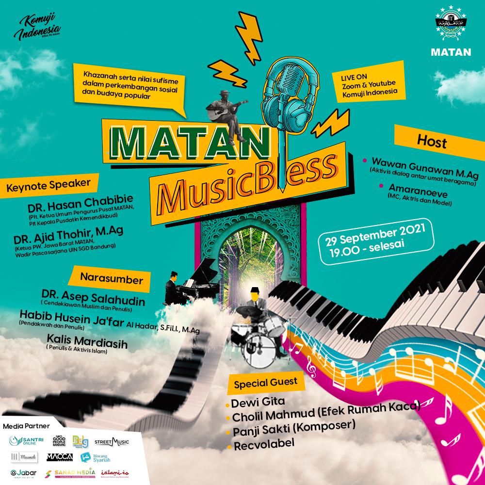 Pengurus Pusat MATAN (Mahasiswa Ahlith-Thoriqoh al Mu?tabaroh an-Nahdliyyah) bersama Komuji (Komunitas Musisi Mengaji) menyelenggarakan talks show bertajuk Matan Music Bless dengan tema ?Khazanah serta nilai sufisme dalam perkembangan sosial dan budaya popular? yang akan disiarkan secara langsung melalui Zoom dan Youtube Komuji Indonesia pada Rabu 29 September 2021 mulai pukul 19.30 WIB.