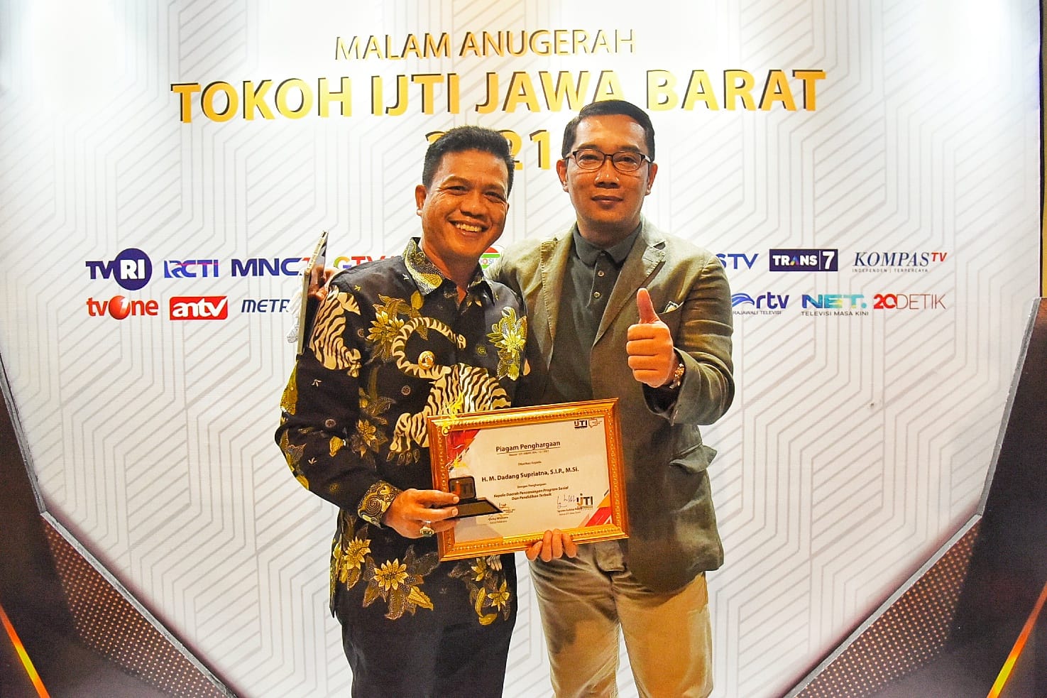 Bupati Bandung Dadang Supriatna meraih penghargaan sebagai Kepala Daerah dengan Program Sosial dan Pendidikan Terbaik dari Ikatan Jurnalistik Televisi Indonesia (IJTI) Jawa Barat (Jabar).