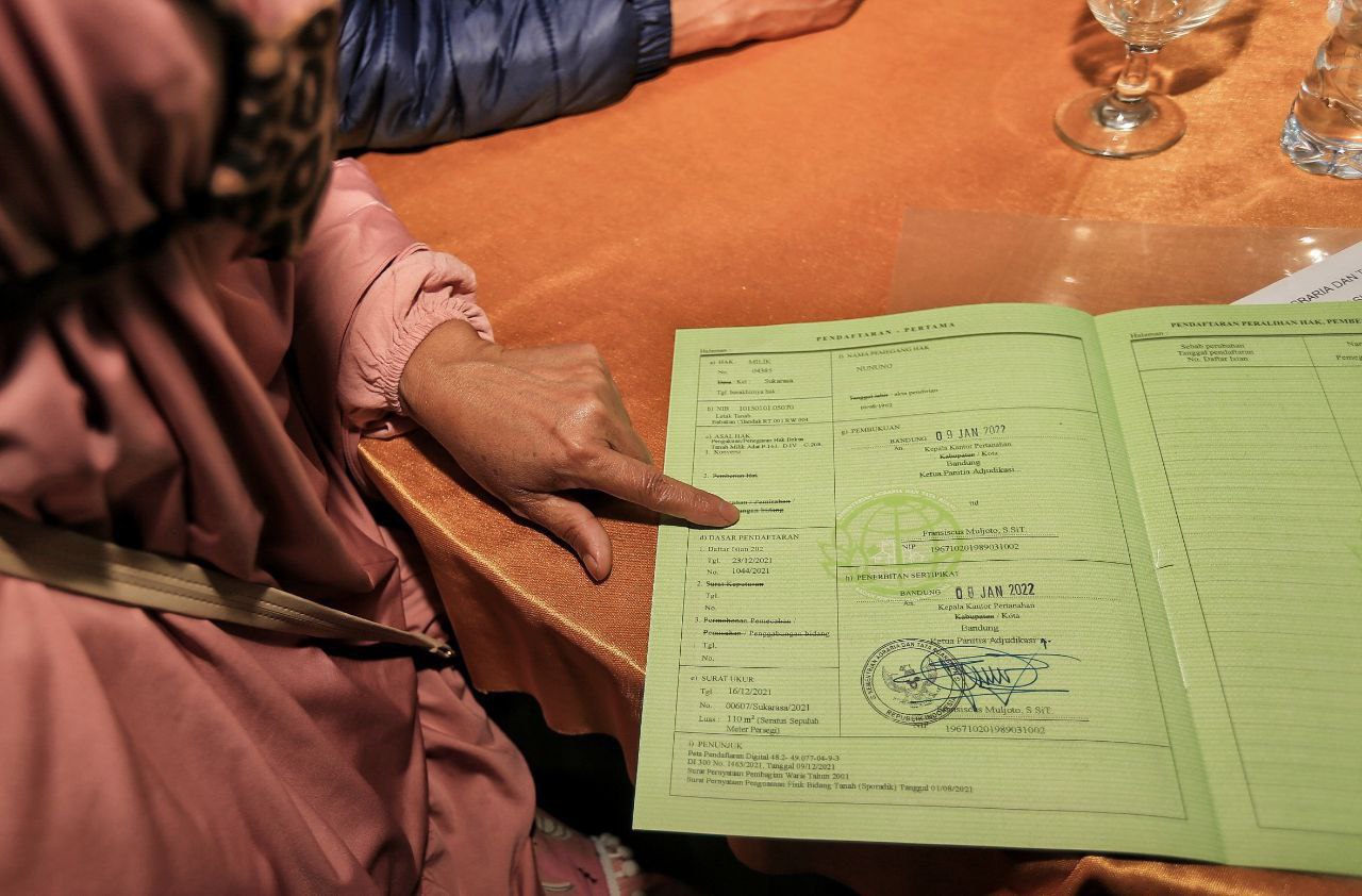 Pelaksana Tugas (Plt) Wali Kota Bandung, Yana Mulyana didampingi Kepala Kantor Pertanahan Kota Bandung, Andi Kadandio Aleppudin menyerahkan secara simbolis kepada masyarakat yang memiliki hak atas tanah sebagai kepemilikannya, di Hotel Summer Hill, Selasa 25 Januari 2022.