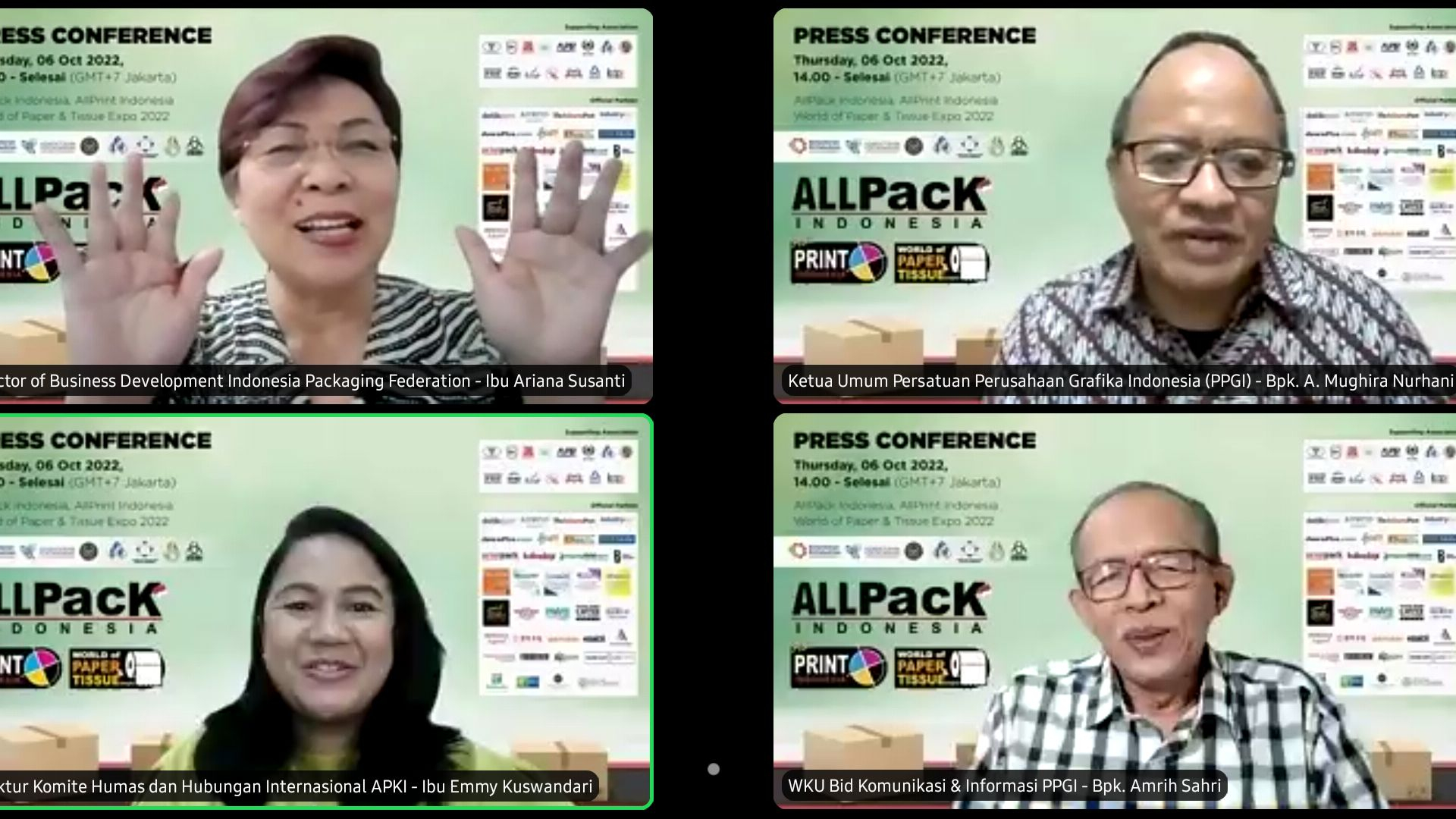 “Pameran Internasional di bidang teknologi pengolahan dan pengemasan makanan, minuman, biskuit, konfeksioneri, farmasi, jamu, kosmetik, pertanian, elektronika, hingga industri lain kami hadirkan sekaligus dengan industri percetakan mulai solusi untuk teknologi penncetakan, suplai mesin, sampai industri kertas dan tisu dimulai pada 12-15 Oktober 2022 di Jakarta International Expo, Kemayoran,” kata Daud Salim selaku CEO Krista Exhibitions saat zoom, Kamis (6/10/2022).