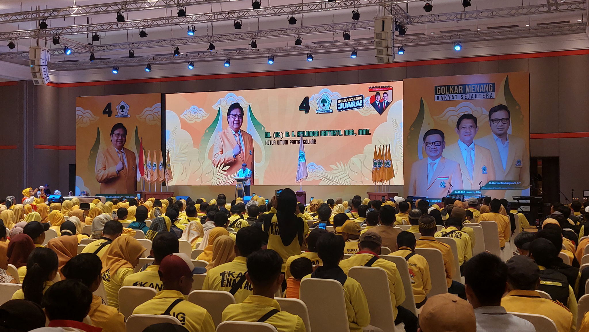 BANDUNG – Partai Golongan Karya (Golkar) Jawa Barat melakukan konsolidasi pemenangan pada Pemilu 2024 di Grand Sudirman Ballroom, Jalan Sudirman, Kota Bandung pada Jumat 19 Januari 2024. Sebanyak 3000 saksi pun hadir untuk mendengarkan pemaparan dari Ketua Umum Golkar, Airlangga Hartarto.