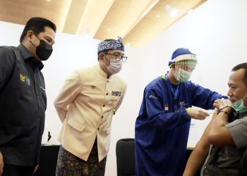 Gubernur Jawa Barat (Jabar) Ridwan Kamil bersama Menteri BUMN Erick Thohir meninjau sentra vaksinasi COVID-19 di Eldorado Convention Hall di ...